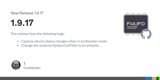arrow-up11arrow-down1external-linkNew Release 1.9.17 · fwupd/fwupdplus-squaregithub.competsoi@discuss.tchncs.de to Linux@discuss.tchncs.de · edit-22 years agomessage-square0linkfedilink